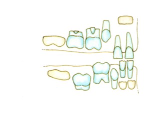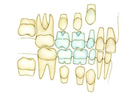 Lo schema illustra a quali età mediamente compaiono i denti in arcata. In azzurro vediamo i denti da alatte, in avorio i denti permanenti. Controllate in quale fase siete e se c'è corrispondenza fra l'età e il cambio dei denti.