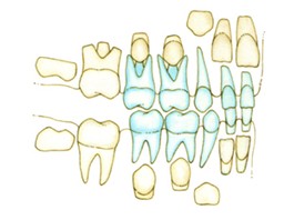 L'eruzione dei denti decidui - che chiamiamo denti da latte - comincia intorno ai 6- 8 mesi di età e si completa in genere entro i 24 mesi. I denti decidui son 20 in tutto, 10 per arcata.